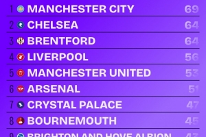 本赛季英超球队运动战创造重大机会榜:曼城69次居首,阿森纳51次