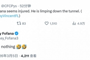 此役韦斯利·福法纳为切尔西首发出战,有媒体称这位切尔西后卫看起来受伤了,走进球员通道时一瘸一拐,但福法纳社媒辟谣,他表示:“嗯?我没事。”