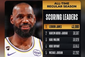 在本场比赛中,詹姆斯常规赛生涯总得分突破43000里程碑,赛后他转发了个人海报勉励。