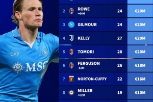 意甲英籍球员身价榜:麦克托米奈4500万欧居首