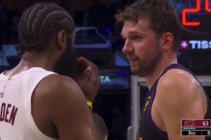 GIF-哈登和东契奇在场上聊天,还捂着胡子