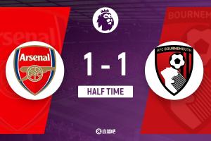 上半场补时2分钟。半场战罢,阿森纳1-1伯恩茅斯。